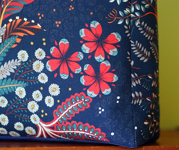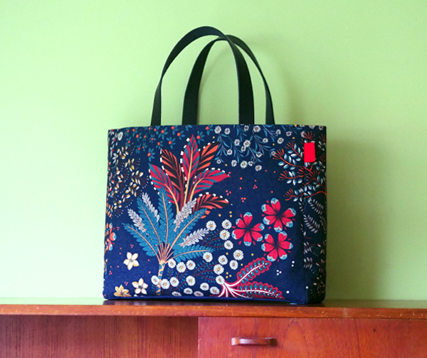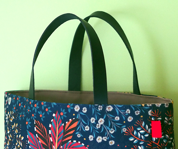 ○持ち手にと底にはネイビー、内側にはベージュを合わせます。